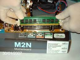 Esto se puede hacer más fácilmente con la tarjeta madre fuera de la torre. Se insertan las tarjetas de memoria en las ranuras de memoria (ver gráfico). La memoria solo se puede insertar en una de las dos posiciones obvias. Los terminales metálicos son los que se insertan en la ranura. Las tarjetas se insertan a un ángulo de aprox. 45 grados y después se giran hasta que quedan asegurados por dos grapas. Es remotamente posible que haya que cerrar algunos interruptores (jumpers) en la tarjeta madre según el tipo de memoria, revisen el manual de la tarjeta madre. Los interruptores de este tipo (jumpers) se conectan al colocar una pieza pequeña de plástico y metal que viene con la tarjeta madre entre los alambres del interruptor.